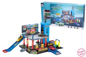 Dráha so svietiacim autíčkom. Rozmery zostavenej dráhy 88x27x48 cm.