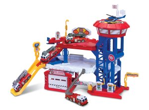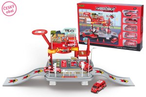 Hasičská stanica s autami. Rozmery 65x19x24,5 cm.