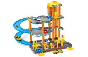 Trojposchodová plastová garáž. Súčasťou balenia sú 3 kovové autíčka a 36 doplnkov, ako napr.značky.
