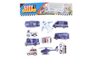 Sada policajných áut obsahuje 7 policajných plastových áut, 1x sanita, 1x lietadlo a 1x helikoptera. Veľkosť prostriedkov cca 6 cm. Rozmer balenia 20,5 x 23,5 cm. Vek 3 +