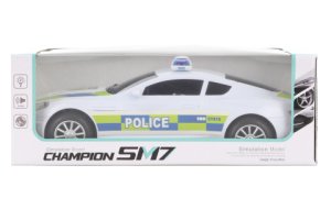 Plastové policajné auto na batérie o rozmere cca 22,5 x 9,5 x 7,5 cm.