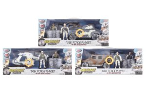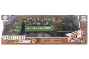 Vojenská sada na batérie. Balenie obsahuje helikoptéru, auto alebo delo (podľa druhu), 2 vojakov, úkryt a zbrane.