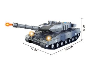 Tank so svetlom a zvukmi na zotrvačník o veľkosti cca 8 cm X 18 cm. Prevádzka na 3 gombíkové batérie. Tank svieti, vydáva zvuky motora, streľby.
