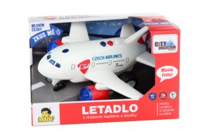 Plastové lietadlo na batérie. Lietadlo po stlačení tlačidla hovorí česky (3 tlačidlá - hlásenie pre štart, let a pristátie lietadla) a svieti.