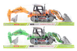 Plastový stavebný traktor o veľkosti cca 43 x 12 x 11 cm.