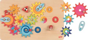 Skladanie farebných drevených ozubených kolies na podložku je len polovica zábavy.