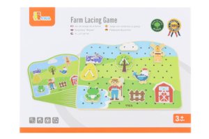 Táto navliekacia hračka s motívom farmy obsahuje drevenú hraciu dosku, 20 navliekacích doštičiek, 3 nite a 10 kariet so šablónami, ktoré ukazujú rôzne spôsoby navliekania doplnkov na dosku.