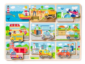 Motorická hračka WOODY Kam ide autíčko Úlohou dieťaťa je umiestniť dopravné prostriedky do prostredia, do ktorých patrí Loď na more, hasičské auto pred hasičskú stanicu, nákladné auto na stavenisko atď.