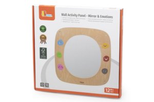 Drevený nástenný panel so zrkadlom a výrazmi na tvári.