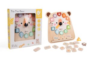 Roztomilé drevené hodiny s motívom medveďa pomáhajú deťom zábavnou formou naučiť sa poznávať čas.
