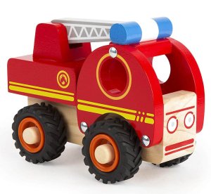 Drevené hasičské autíčko o veľkosti cca 15,5 x 11,5 x 5 cm.