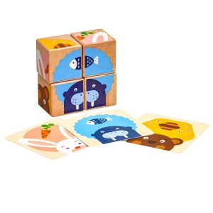 Čo zvieratká jedia sú drevené skladacie obrázkové kocky s predlohami, z ktorých je možné zložiť 6 rôznych obrázkov so zvieratkami a ich maškrtami.
