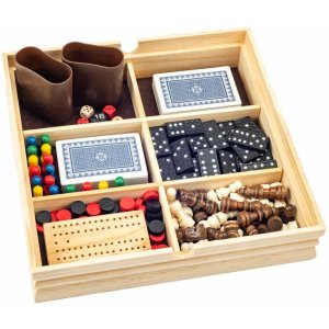 Stolové hry WOODY Súbor hier - veľký Niekoľko stolných hier v jednom drevenom boxe Šach, dáma, človeče nehnevaj sa, vrchcáby, backgammon, mlyn, kamene pre domino, kocky a karty Obsahuje aj návody k hrám …