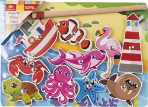 Táto magnetická rybárska hra sa skladá z rybníka, 12 rýb, kocky a dvoch rybárskych prútov.