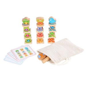 Vkladanie farebných drevených zvieratiek do vyrezaných otvorov hracích doštičiek. 5 hracích doštičiek z prírodného dreva (24 x 7 x 0,5 cm), 25 farebných zvieratiek + 2 hracie kocky.