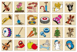 Didaktická hra z drevených kameňov s rozmermi 40x40x6 mm s potlačou Krtka a jeho kamarátov.