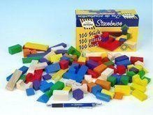 Stavebnica obsahuje 100 farebných drevených dielikov v rôznych tvaroch a veľkostiach.
