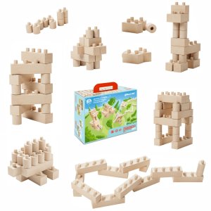Obsahuje 96 dielikov - klasické kocky, kvádre, valčeky, tyčky, ihlany, "X"ka… niektoré sú navyše prevŕtané, základná veľkosť kocky je 2 cm