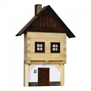 Drevená zlepovacia stavebnica obsahuje drevené hranolčeky daných dĺžok k stavbe zrubových stien, diely na strechy a štíty, kartónové výseky okien a dverí aj predtlačené papierové potlače.