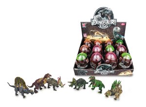 Vajíčko, v ktorom je schovaná plastová figúrka dinosaura. 6 rôznych dinosaurov, nazbieraj ich všetky.