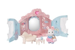Hracia sada Sylvanian Families Štýlový šatník obsahuje krásny trblietavý kočiar, doplnky a figúrku dievčatka z rodiny Snežných králikov oblečenú do princeznovských šiat.