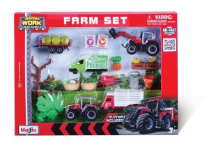 Farma set. Súčasťou hracia mapa, budova, chliev, žeriav na kľučku, nádrž, rebrík, 2 traktory s príslušenstvom, 2 figúrky farmárov, figúrky zvieratiek (kôň, prasa, krava), vstupná brána, oplotenie, ceduľa, rozcestník …