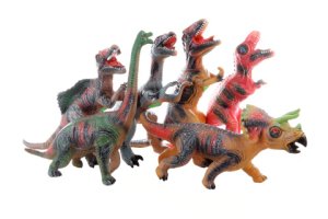 Dinosaurus má na spodnej strane tlačidlo a po stlačení vydáva zvuky. 4 druhy – Brachiosaurus, Tricertops a dva designy T-Rexa.