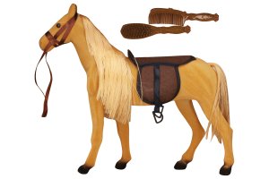 Kôň svetlý. Veľkosť 35cm. Obalenie obsahuje kone so sedlom a dva hrebene.