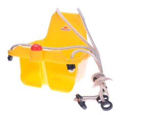 Žltá detská závesná hojdačka, ktorá je vďaka svojej konštrukcii určená pre veľmi malé deti.