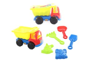 Súprava na piesok obsahuje auto, lopatku, sitko, hrabličky a 25 bábovky. balené v sieťke.