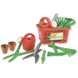 9dielna sada záhradníckeho náradia v praktickom košíku pre malých záhradníkov, vyrobená z kvalitných plastov v Taliansku.