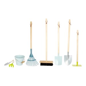 Rozmery: rýľ cca 12x2, 5x71 cm, hrable cca 15x6, 5x60 cm, hrable na lístie cca 20x2, 5x73 cm, kanvička 2v1 18x9, 5x23 cm Vek: 3 + Materiál: kov, drevo, syntetika Sada obsahuje: 4