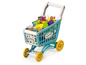Nákupný vozík s potravinami. Rozmery vozíka 40 x 24,5 x 44 cm.