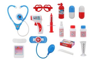 Drevená doktorka v kufríku v českej krabici. Balenie obsahuje fonendoskop, kladivko, teplomer, injekčnú striekačku, lekársku kartičku, nádobku na lieky a nádobku na mastičku.