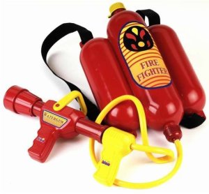 Malý hasič na svoju prácu potrebuje aj hasiaci prístroj na chrbát.
