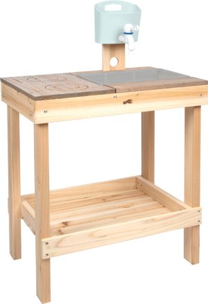 Rozmery: 52x35x79 cm Výška pracovnej plochy: 56 cm Vek: 3+ Materiál: drevo, plast Obsah balenia: vonkajšia kuchynka, plastový drez, dávkovač vody s kohútikom