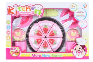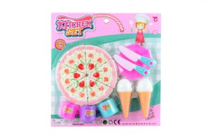 Farebná sada krájania torty. Sada obsahuje tortu, ktorej časti sú spojené suchým zipsom, 2 nožíky, tanierik, 3 hrnčeky a 2 zmrzliny.