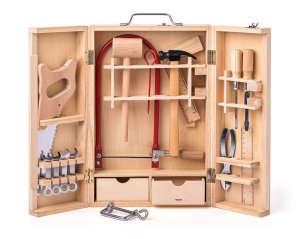 Drevená basa s náradím. Obsahuje skrutkovač, kladivko, kľúč, skrutky, matice a doštičky na skrutkovanie.