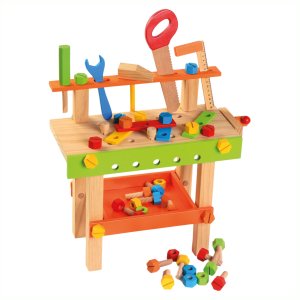 Rozmery: 45x28x52 cm, výška pracovnej plochy 30 cm Vek: 3+ Materiál: drevo Obsahuje: 1 zverák, 3 perforované pásky, 1 meter, 1 pílka, 2 skrutkovače, 1 kladivo, 5 skrutiek, 5 matiek, 3 drevené klince