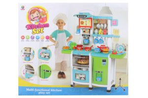 Táto kuchynka v atraktívnom pistáciovej dizajne má dve poličky, otváracie dvierka k rúre, mikrovlnke aj skrinke pod drezom, otočné gombíky pri varnej dosky aj u drezové batérie.