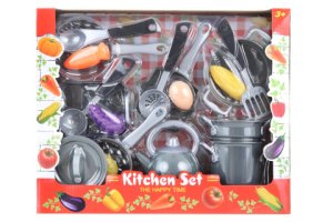Sada plastového riadu obsahuje kanvicu, hrniec, sito, rajnicu, panvicu, pokrievku a ďalšie doplnky.