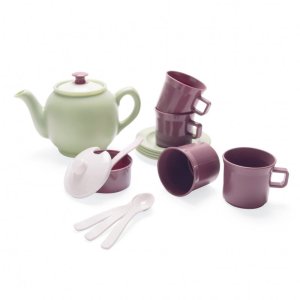 Plastový čajový servis obsahuje kanvicu, cukorničku, dve šálky s podšálkami, dve tácky so zákuskami, vidličku a lyžičku.
