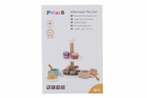 Drevený čajový set. Sada obsahuje stojan, dva taniere, 2 šálky, dve lyžičky a 9 tort.