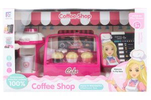 Veľká kaviareň s doplnkami. Balenie obsahuje kávovar, chladničku s tortičky a pokladňu.