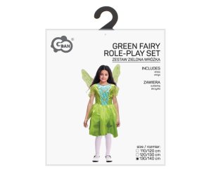 Kostým Zelená víla vo veľkosti 130/140 cm je detský karnevalový odev, ktorý zahŕňa šaty a pripevnené krídla.