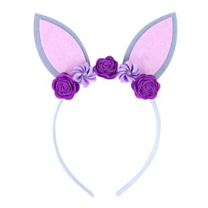 Neprehliadnuteľná karnevalová čelenka s ušami zajačika. Čelenka je vo fialovej farbe, zdobená kvetmi a doplnená rúžovo-šedými uškami.