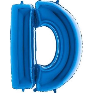 Modrý balónik písmeno D. Balónik je vyrobený z pevnej fólie.