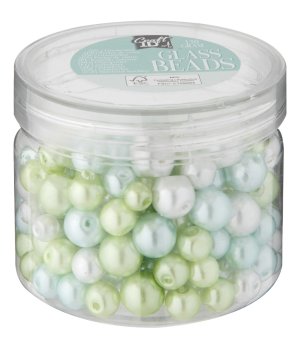Sklenené korálky balené v praktickej priehľadnej pevnej plastovej krabičke s viečkom, celkom 130 gramov korálok rôznych veľkostí v 4 odtieňoch zelenej farby