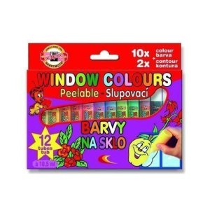 Sada 12 ks 10,5 ml tub v potlačenej kartónovej skladačke farieb na sklo (farby: biela, žltá, svetlá modrá, oranžová, červená, tmavo modrá, fialová, svetlo zelená, tmavo zelená, svetlé hnedá, kontúra čierna, …