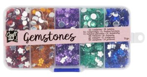 Súprava krásnych farebných drahokamov v 5 farbách a 2 tvaroch (diamanty v tvare štvorca a srdiečka) – celkovo teda 10 rôznych dekoratívnych kamienkov.